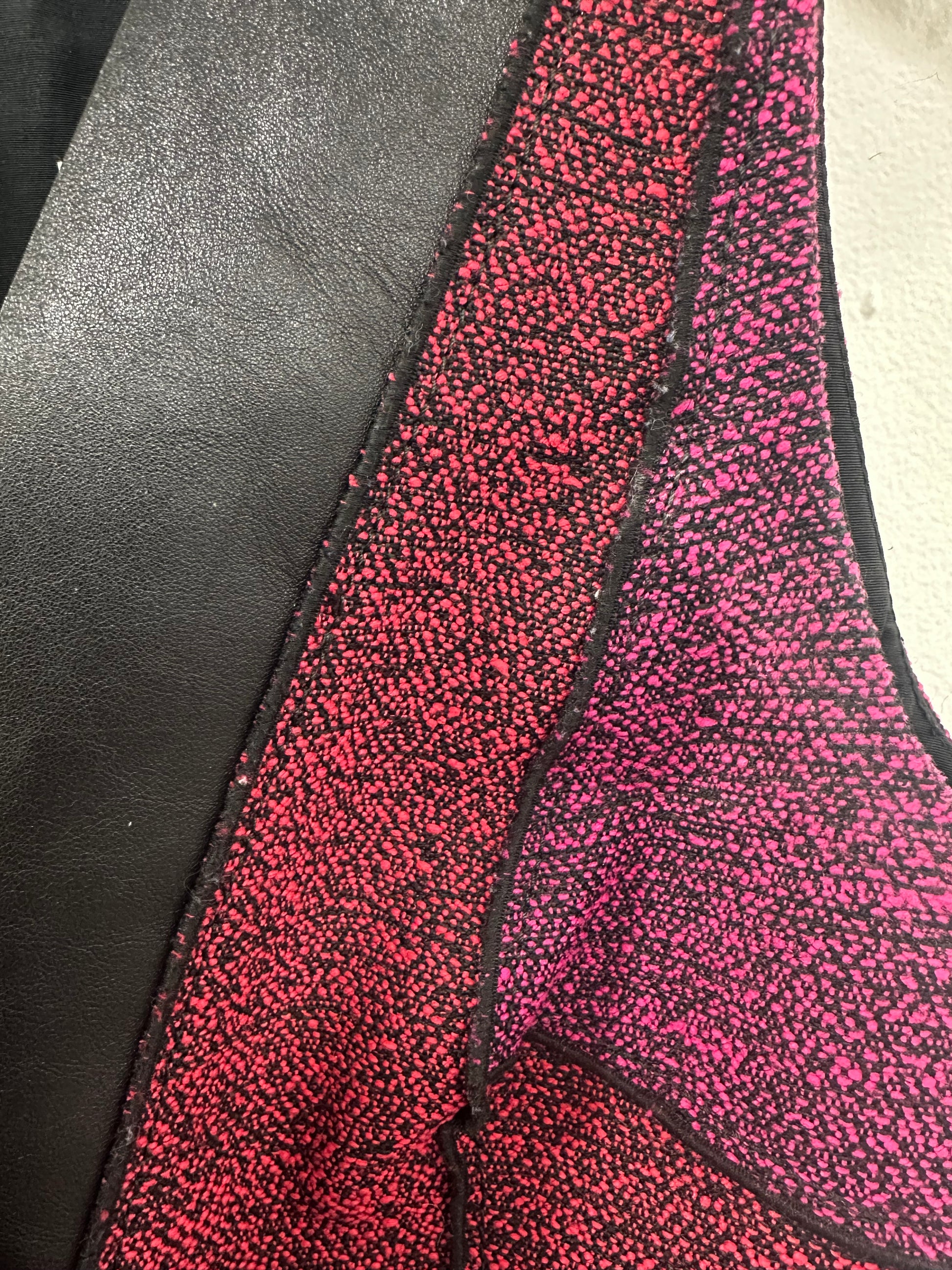 - Pink boucle with leather trim, sleeveless, v-neck, hidden zipper along center back, front slit