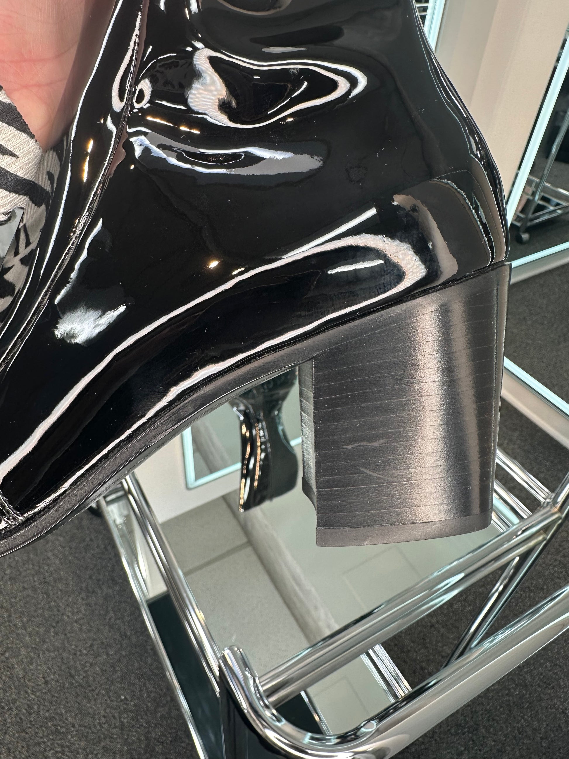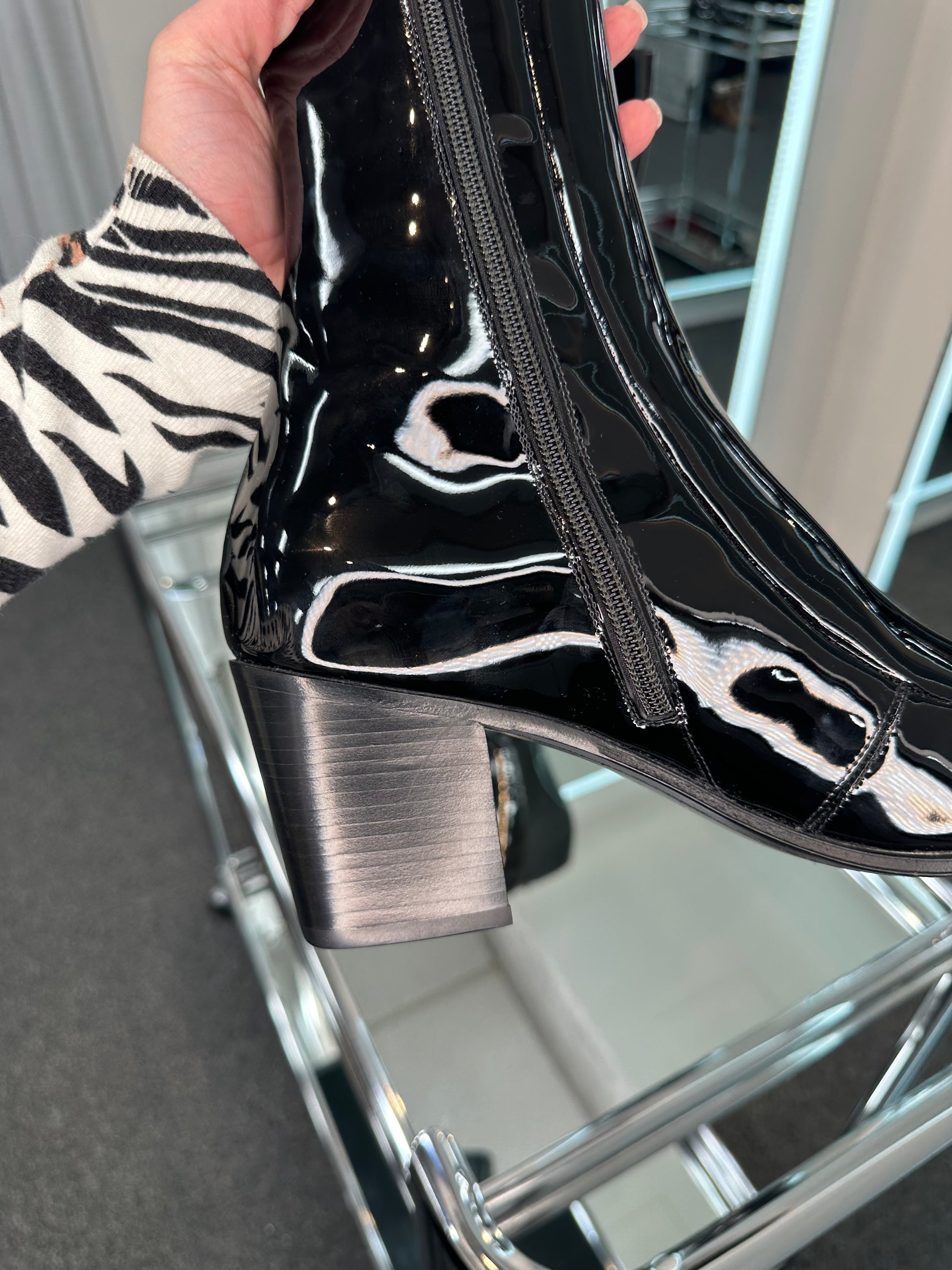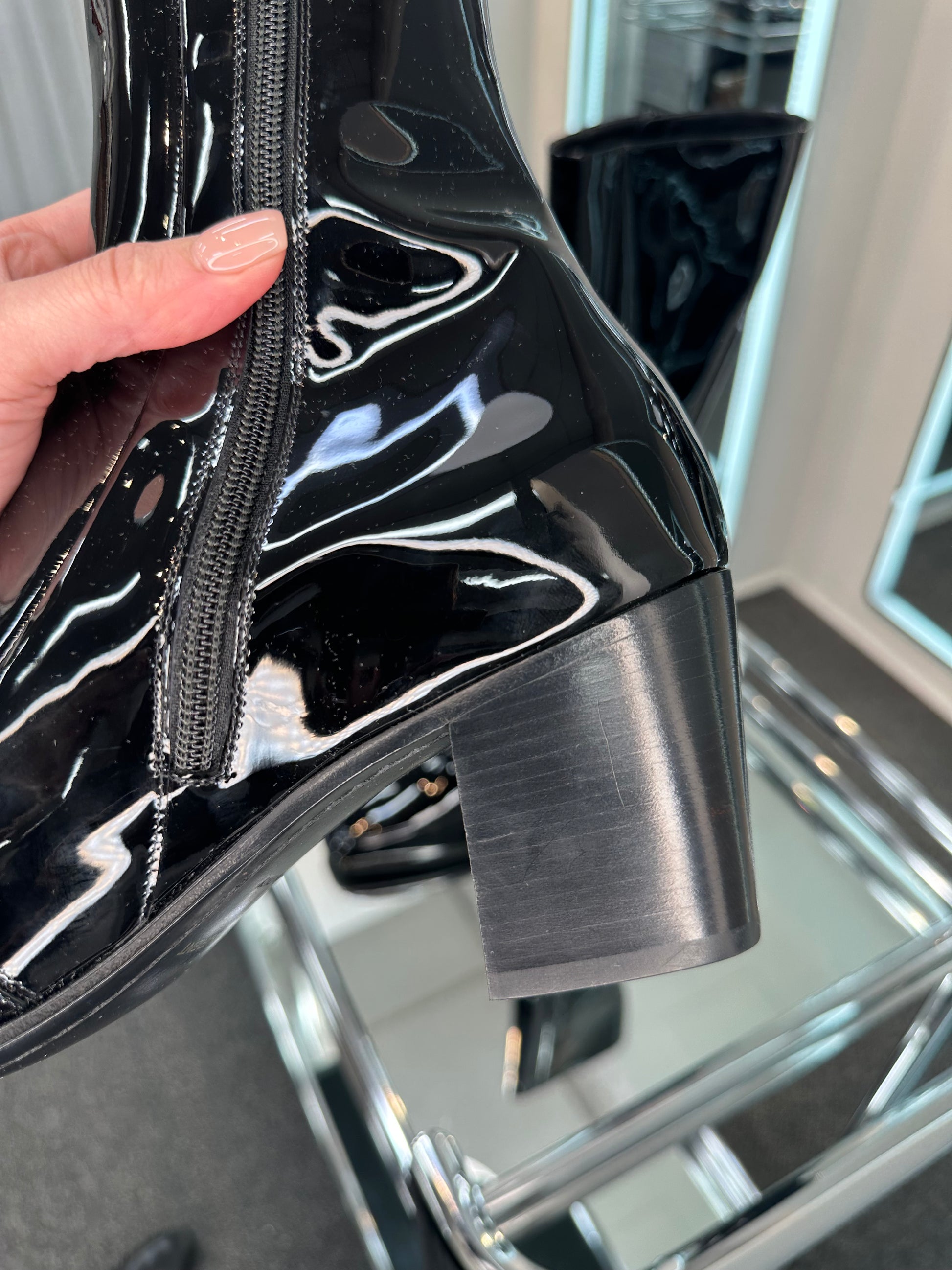 - Black patent leather, stacked heel 70mm, square toe, interior zipper