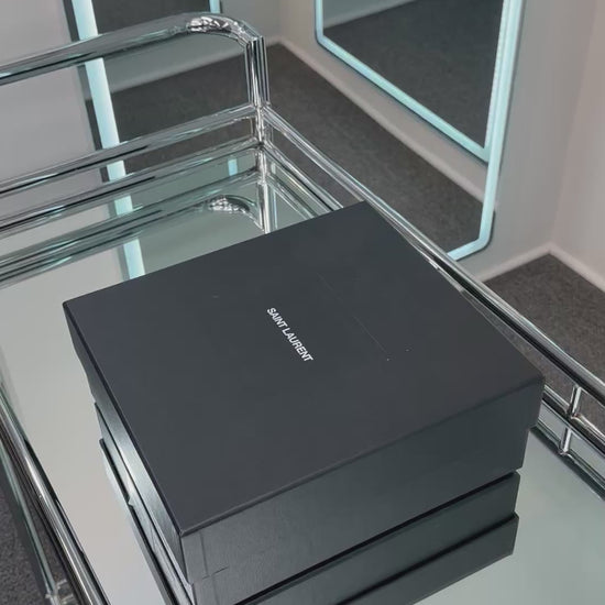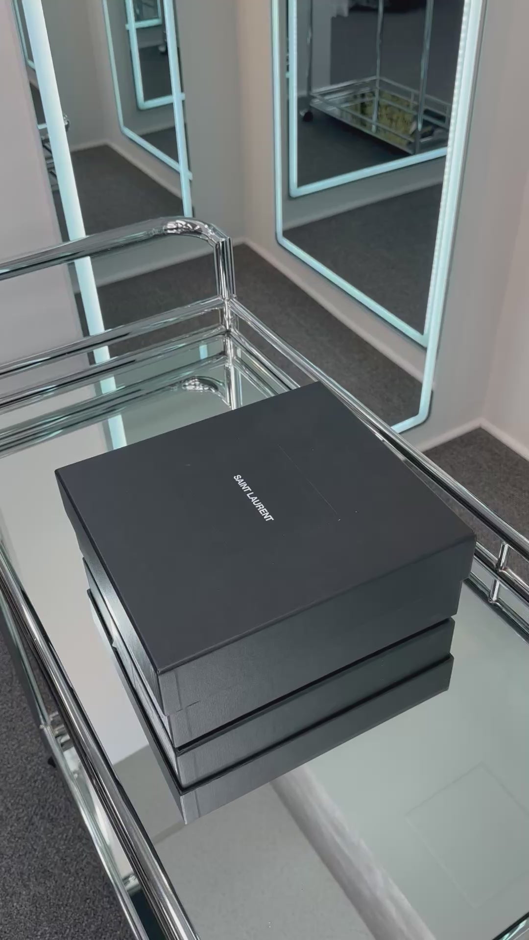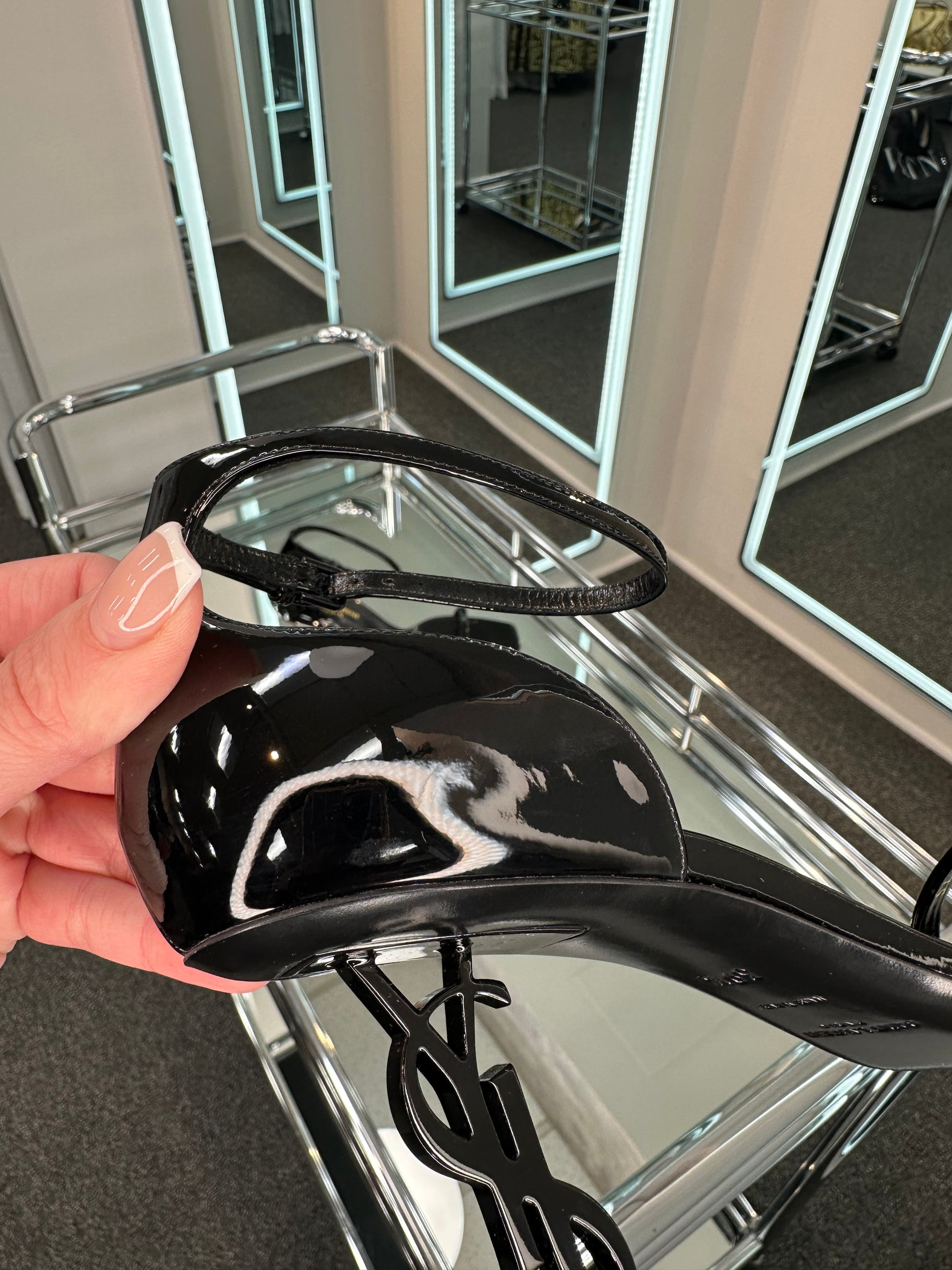 - Black patent, with tonal YSL logo heel 85mm, ankle strap with adjustable buckle, square toe