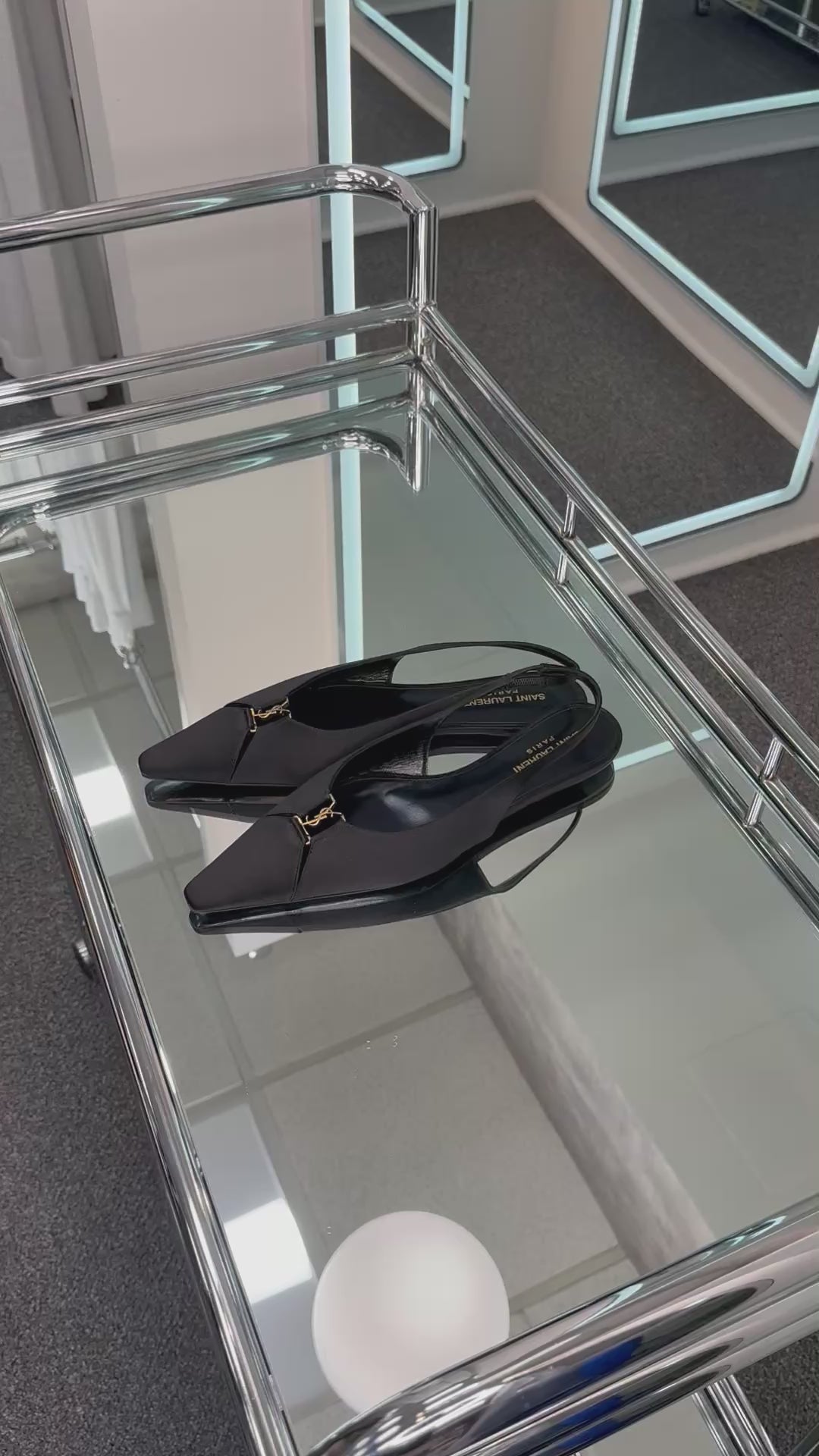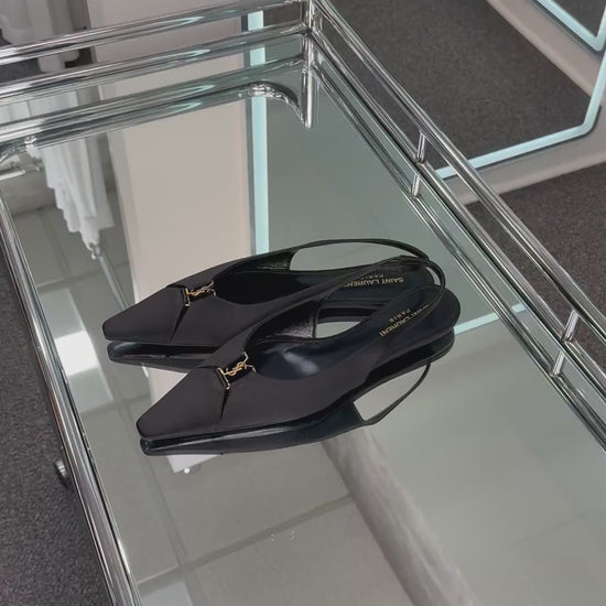 - Black satin, pointe toe, slingback, gold-tone logo hardware