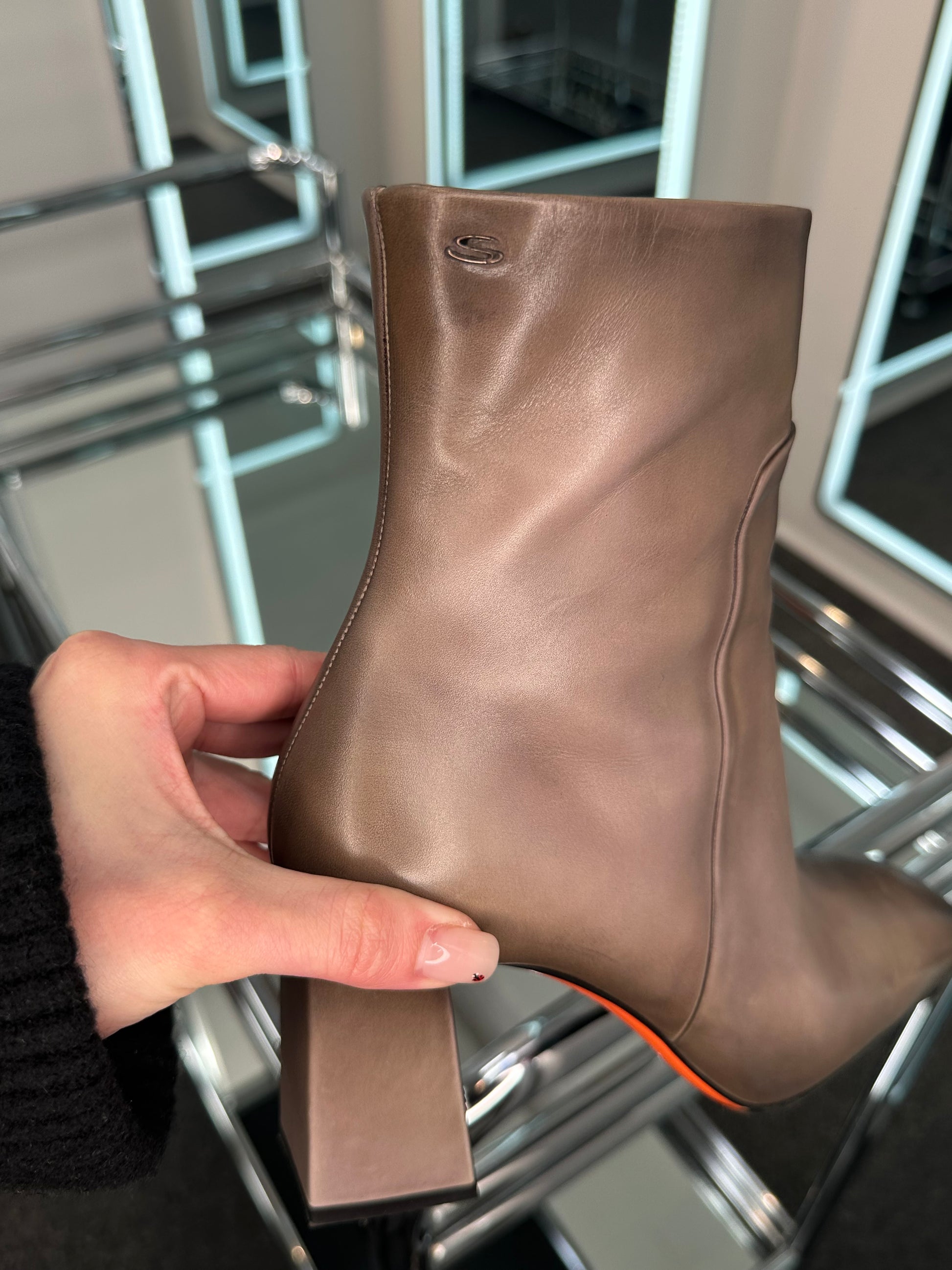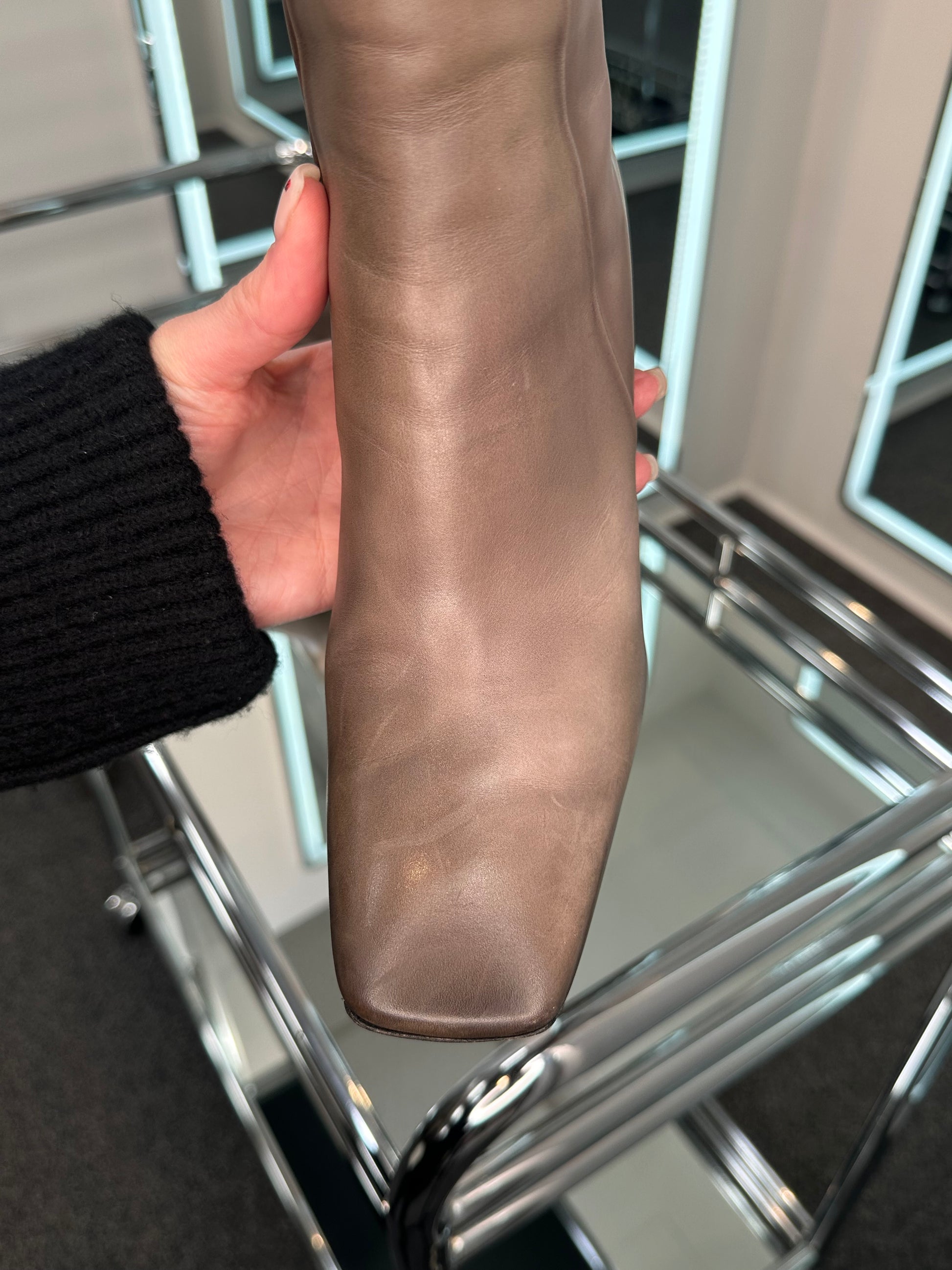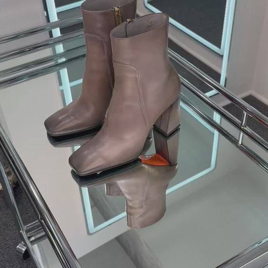 - Taupe/gray ombre calf leather, square toe, stacked heel, interior zip, gold-tone hardware,