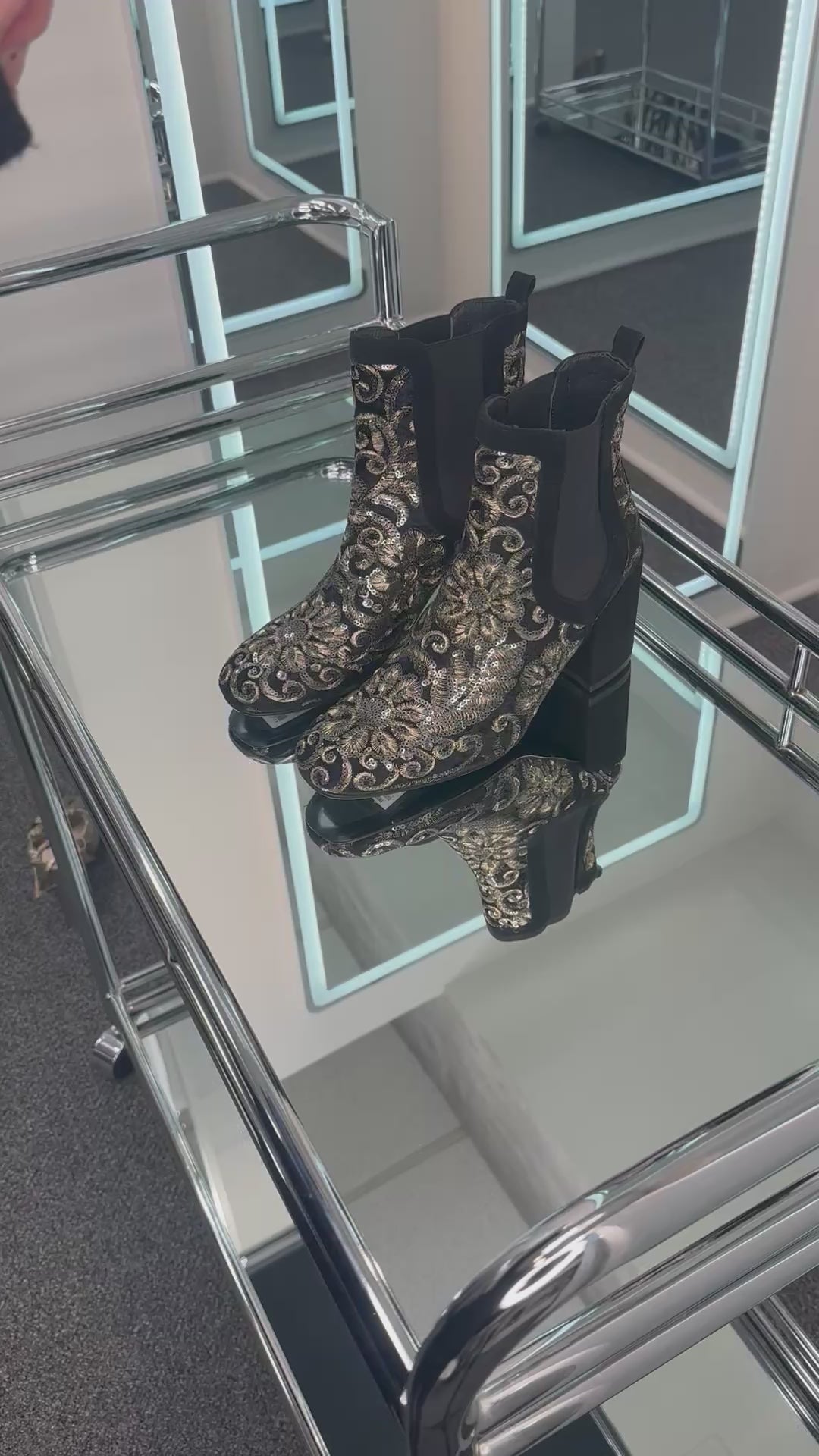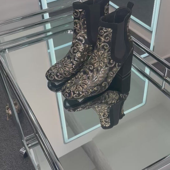 - Black suede trim with black crushed velvet with a taupe sequins and bronze stitching in a floral pattern, stacked heel, pull on