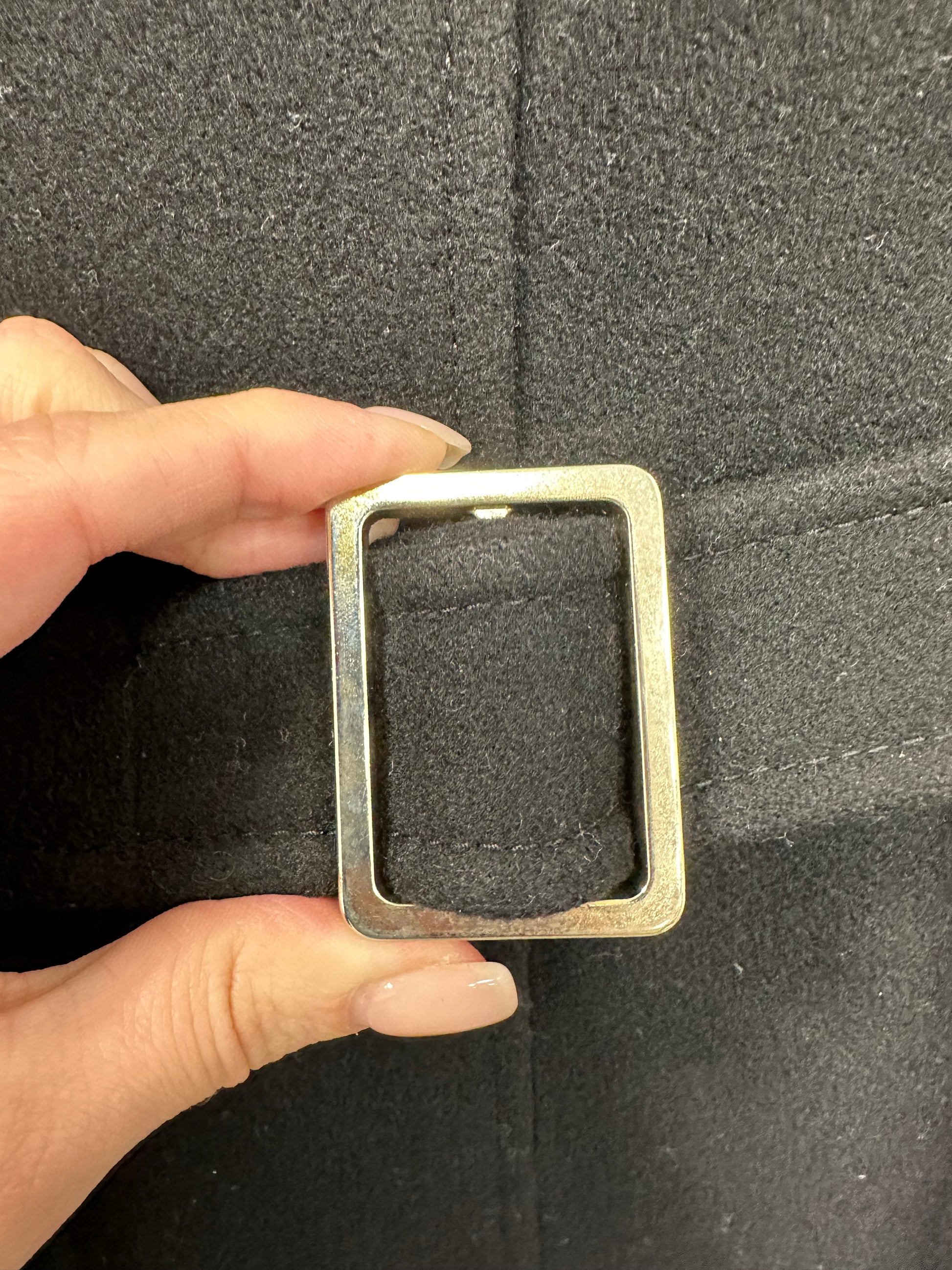 - Black wool, hidden button closure, gold-tone hardware buckle in the back