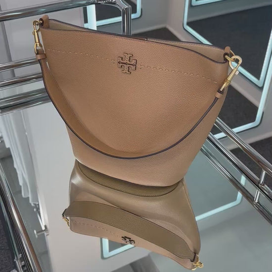 - Camel brown pebbled leather, brass hardware, tonal stitching, detachable flat shoulder strap, magnetic snap closure at the top, single exterior open pocket, unlined, single open pocket