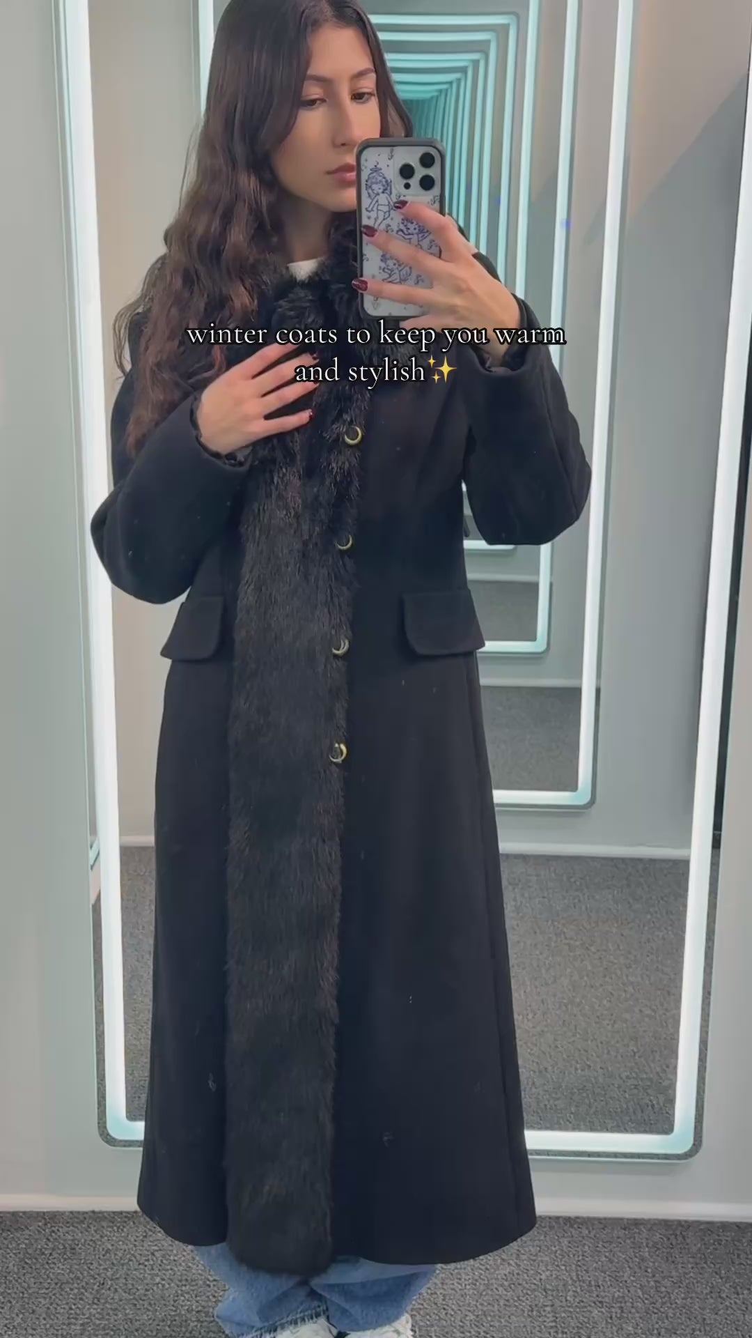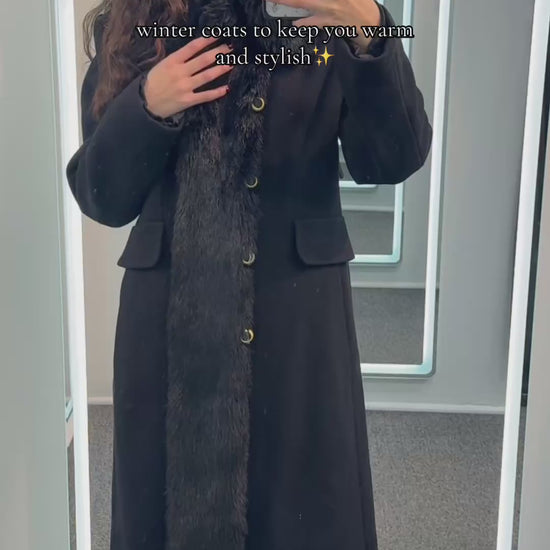 - 75% wool, long, faux fur trim, gold-tone with black buttons, button closure