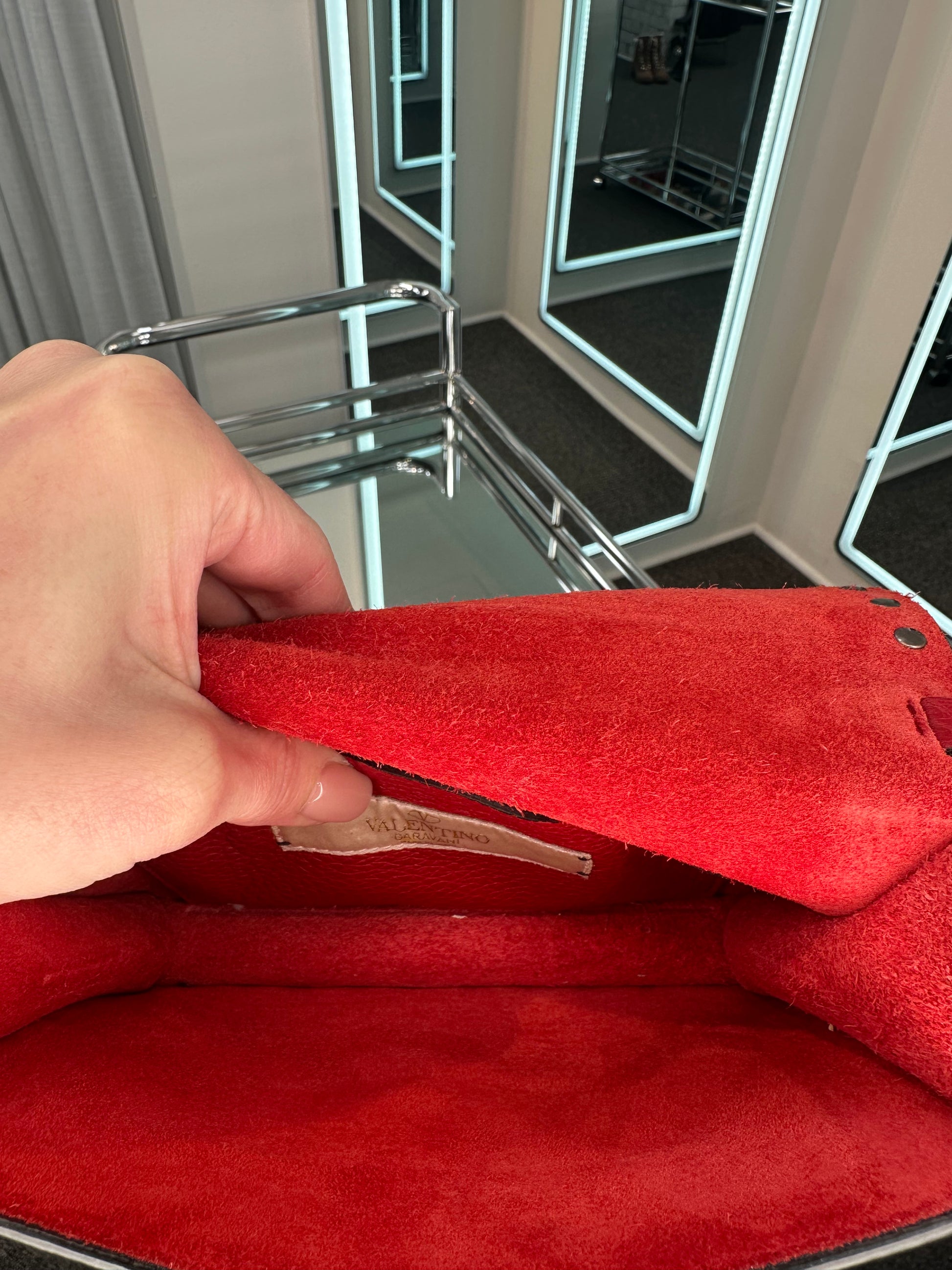 - Red grained leather, silver-tone hardware, rock-stud accent, black stone accent, turn lock closure, front flap, single small open interior pocket, unlined, detachable adjustable crossbody strap