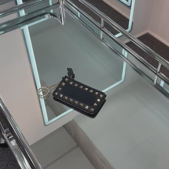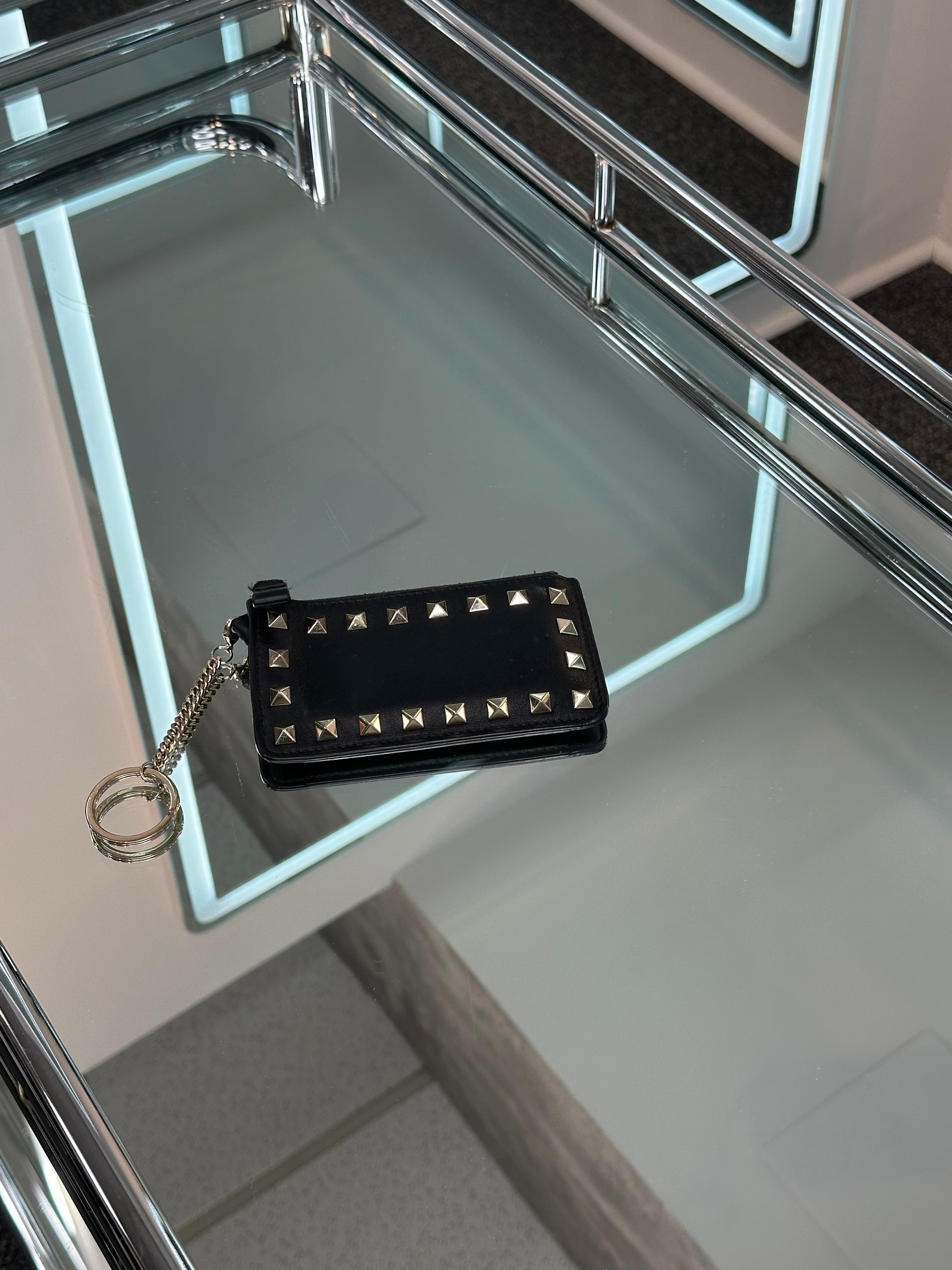 - Black leather, gold-tone rock-stud, detachable key ring, exterior credit card slots, top zipper, canvas interior