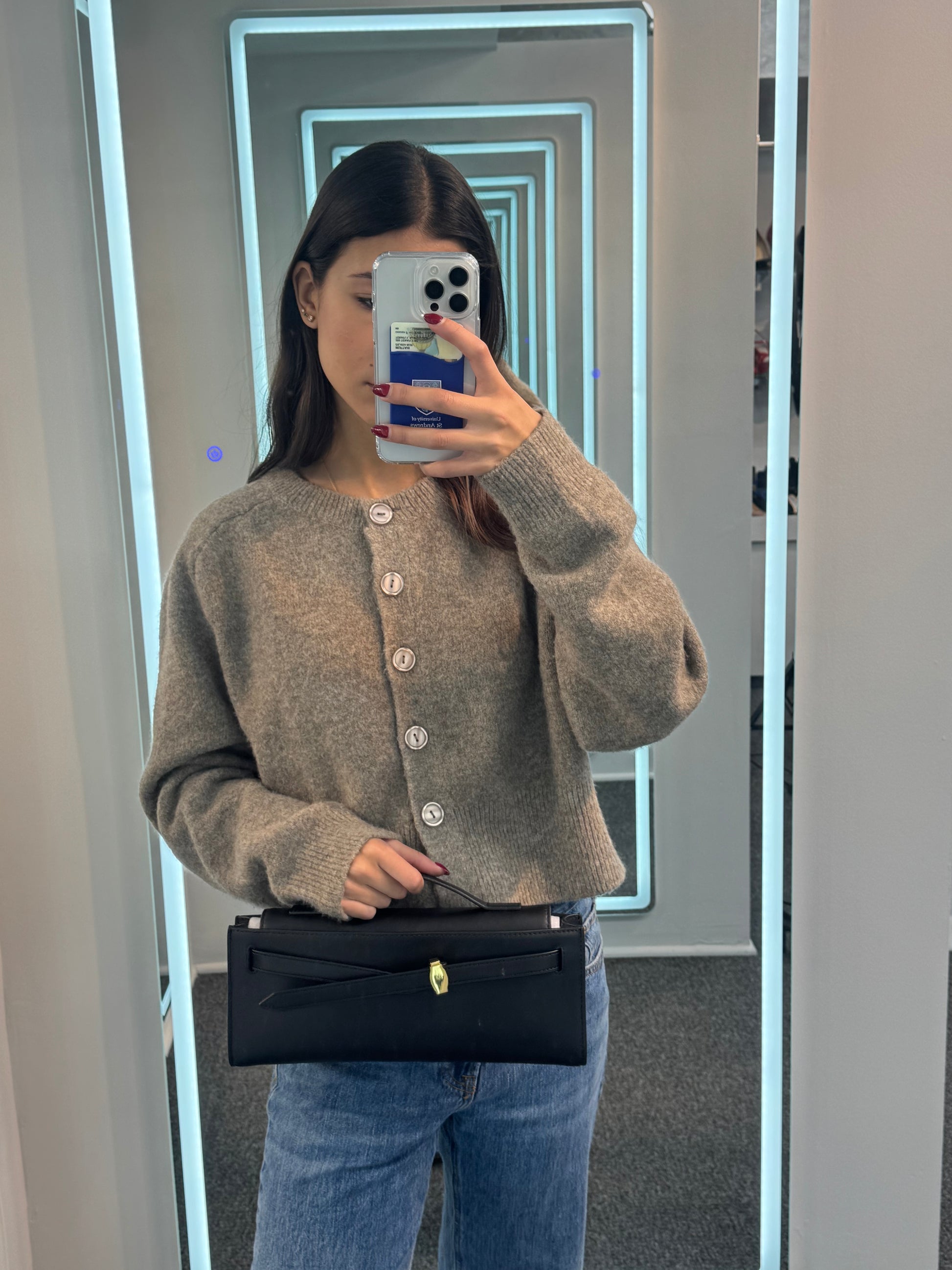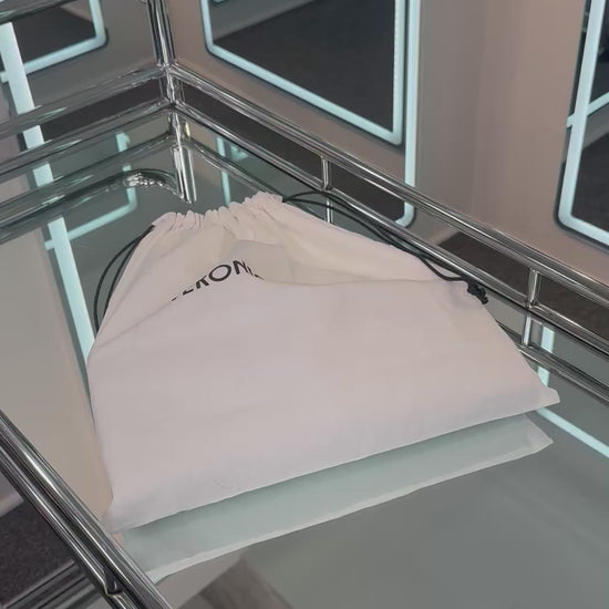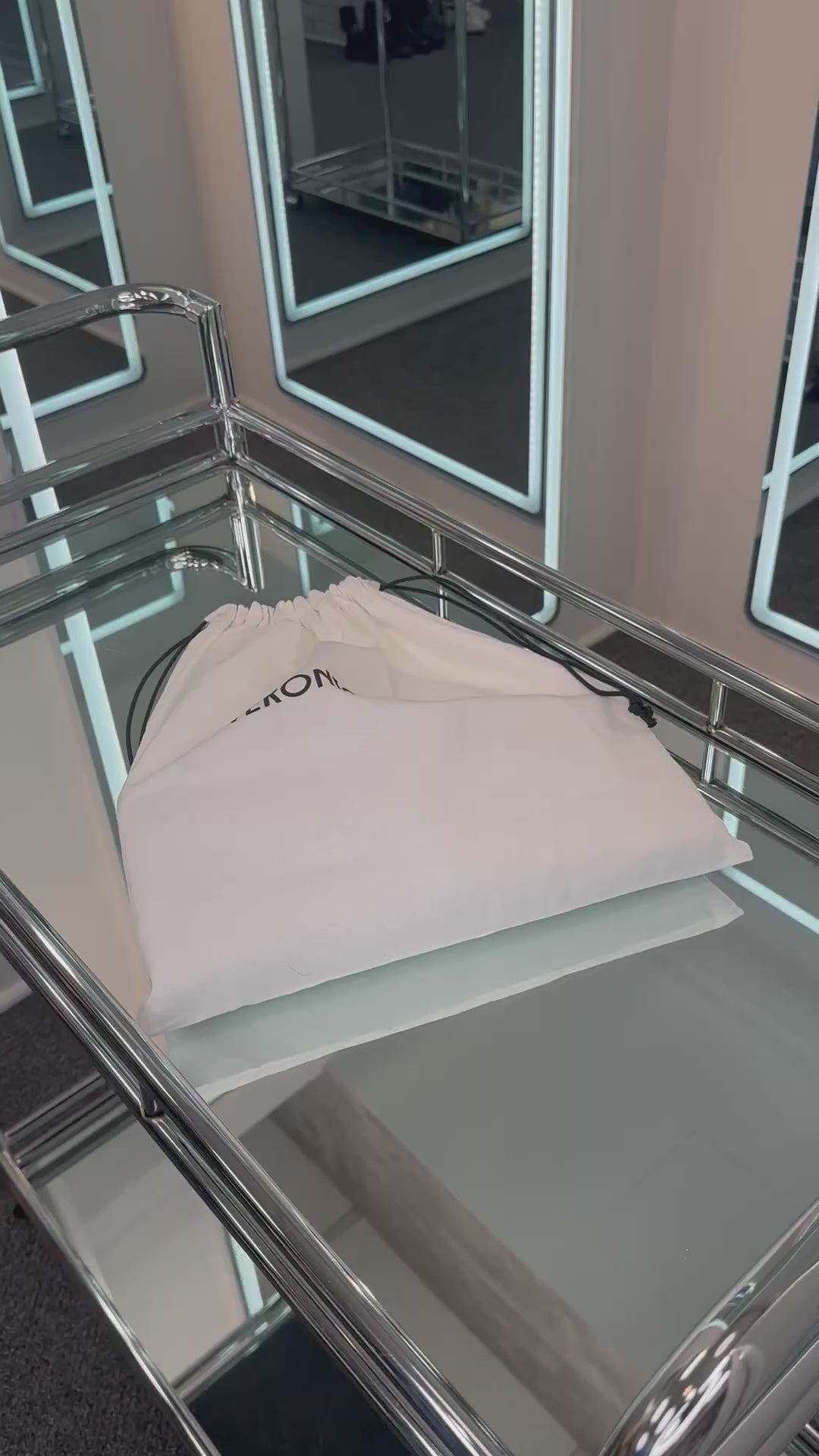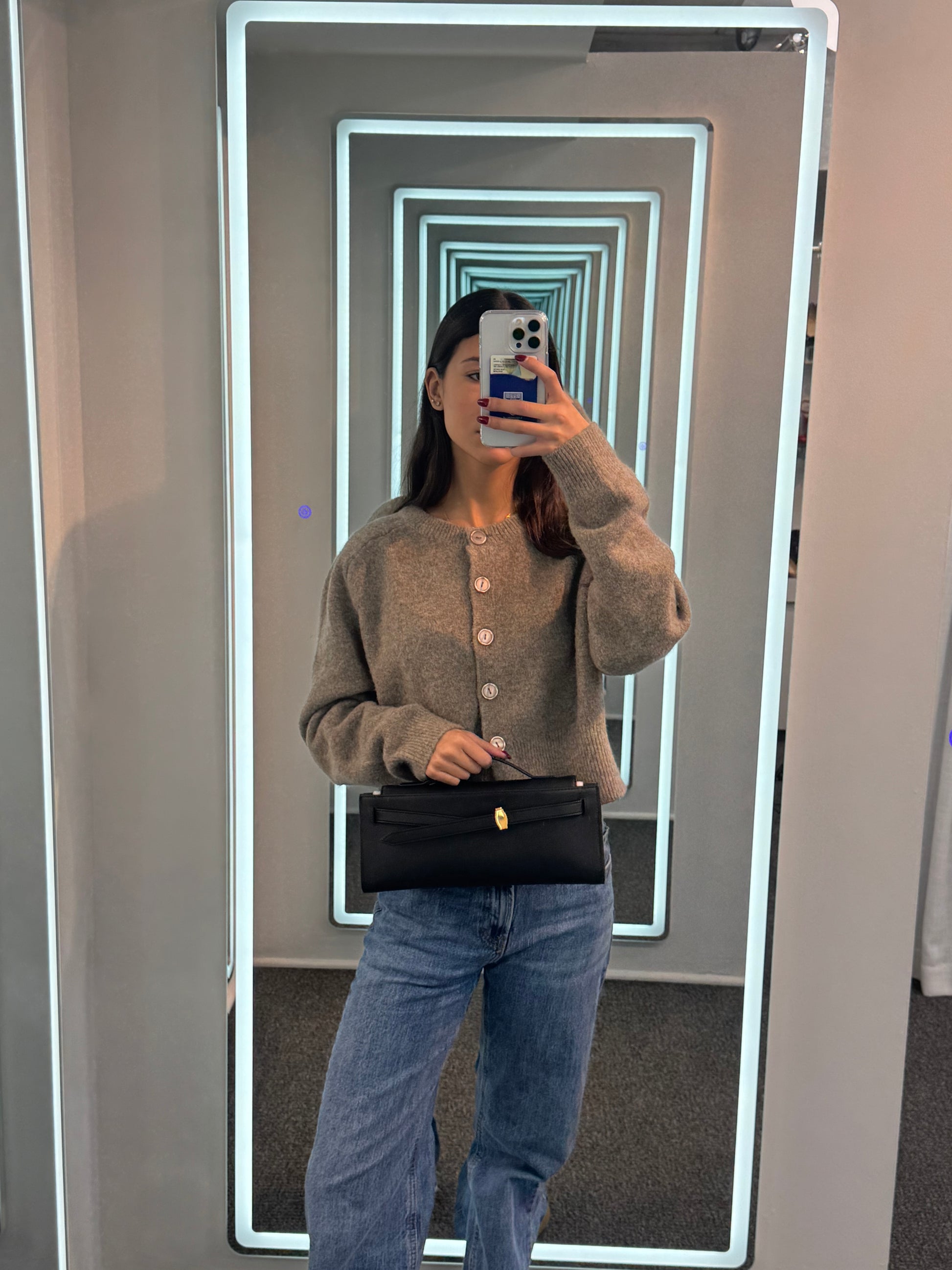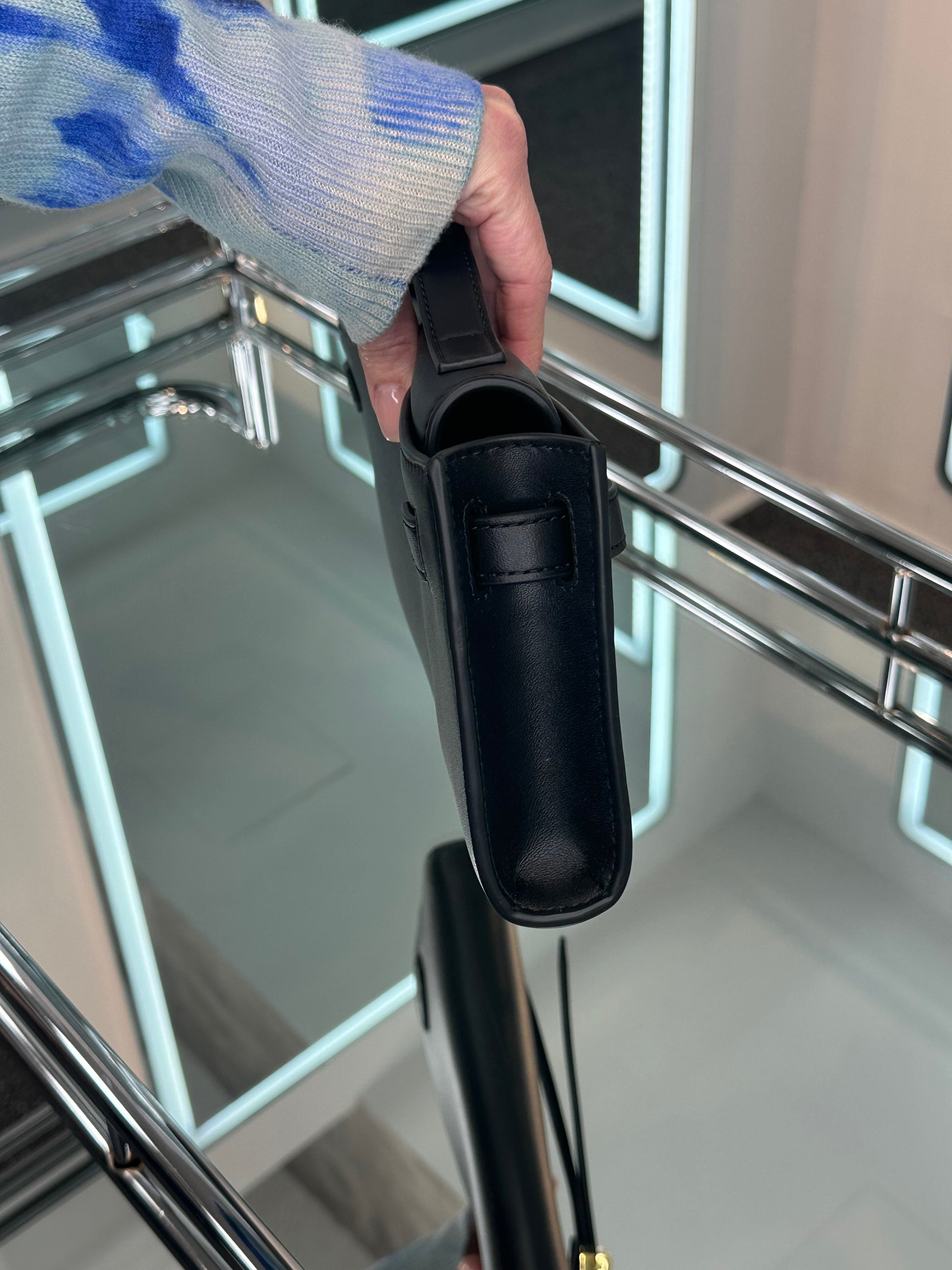 - Smooth black leather, gold-tone hardware, slim flat top handle, belted front detail, snap closure, single interior zip pocket